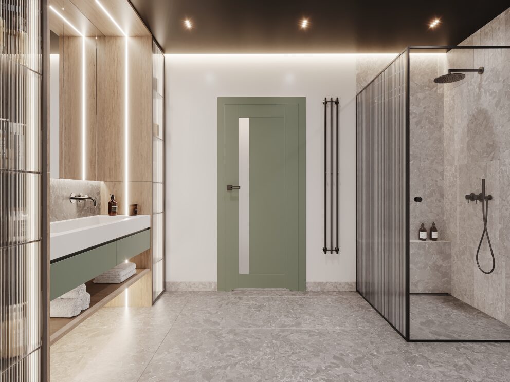 SZKŁO MATOWE LUB MLECZNE – to doskonały wybór, jeśli zależy nam na równowadze między doświetleniem wnętrza a prywatnością. Drzwi z matowym lub mlecznym szkłem subtelnie rozpraszają światło, tworząc przytulny i zarazem intymny nastrój.