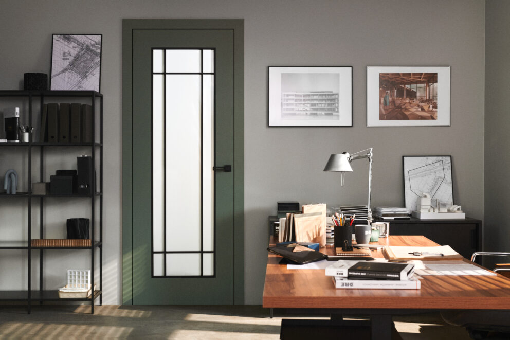 DOMOWE BIURO: w gabinecie postaw na nowoczesny i minimalistyczny design. Drzwi z najnowszej kolekcji Volta dadzą poczucie przestronności i łączności z resztą domu, a jednocześnie subtelnie oddzielą strefę zawodową od prywatnej. Drzwi Volta oparte są na solidnej ramie w kilku modnych matowych kolorach dekoru DRE-CELL: od kaszmiru, szałwii, ciemnego niebieskiego aż po elegancką czerń. Do wyboru mamy szkło przeźroczyste lub matowe, a nowoczesny charakter drzwi podkreślają designerskie pochwyty.
