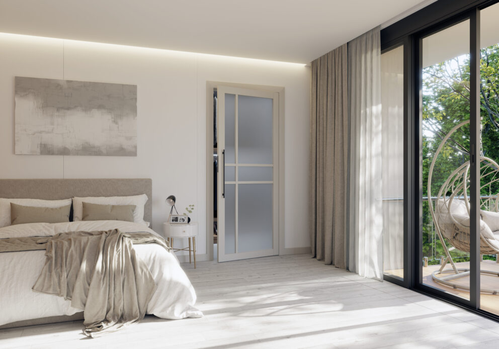 Największym wyzwaniem jest zachowanie równowagi pomiędzy jasną, doświetloną przestrzenią a zachowaniem prywatności. W sypialni, łazience czy garderobie doskonałym rozwiązaniem są drzwi z przeszkleniem matowym, mlecznym lub dekoracyjnym. Pozwalają one cieszyć się naturalnym światłem, jednocześnie gwarantując poczucie komfortu. Taki rodzaj przeszklenia subtelnie rozprasza światło wprowadzając do wnętrza przytulny klimat.